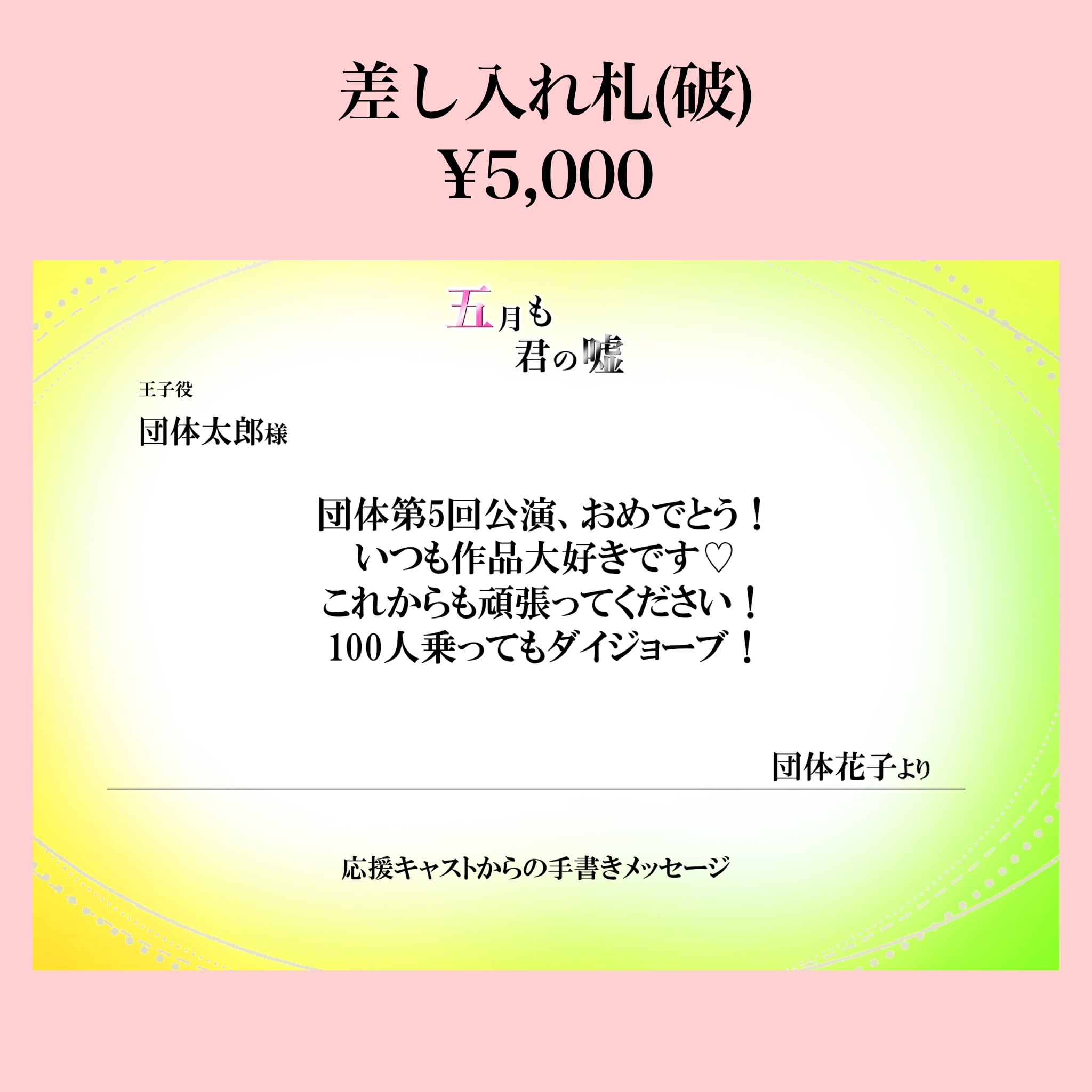 ・ご注文いたただきました差し入れ札は、複製したものを終演後にお持ち帰りいただけます。ご希望の方は開演前にスタッフにお声がけください。
